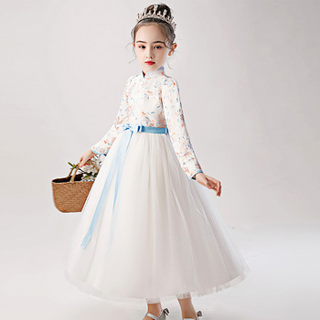 Vestido largo de estilo chino para niñas y niños, vestido de flores brillante para fiesta de boda, venta al por mayor